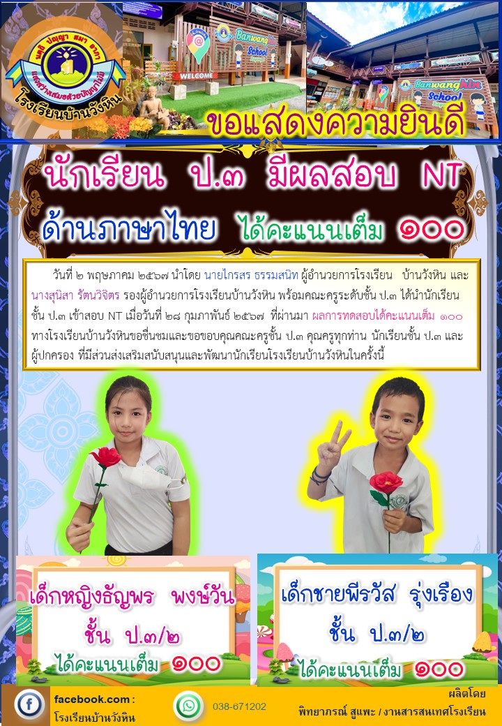 | วันที่ 2 พฤษภาคม 2567 นำโดย นายไกรสร ธรรมสนิท ผู้อำนวยการโรงเรียน บ้านวังหิน และ นางสุนิสา รัตนวิจิตร รองผู้อำนวยการโรงเรียนบ้านวังหิน พร้อมคณะครูระดับชั้น ป.3 ได้นำนักเรียนชั้น ป.3 เข้าสอบ NT เมื่อวันที่ 28 กุมภาพันธ์ 2567 ที่ผ่านมา ผลการทดสอบได้คะแนนเต็ม 100 ทางโรงเรียนบ้านวังหินขอชื่นชมและขอขอบคุณคณะครูชั้น ป.3 คุณครูทุกท่าน นักเรียนชั้น ป.3 และผู้ปกครอง ที่มีส่วนส่งเสริมสนับสนุนและพัฒนานักเรียนโรงเรียนบ้านวังหินในครั้งนี้ |