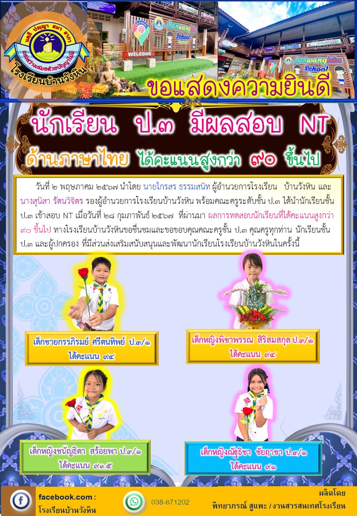 | วันที่ 2 พฤษภาคม 2567 นำโดย นายไกรสร ธรรมสนิท ผู้อำนวยการโรงเรียน บ้านวังหิน และ นางสุนิสา รัตนวิจิตร รองผู้อำนวยการโรงเรียนบ้านวังหิน พร้อมคณะครูระดับชั้น ป.3 ได้นำนักเรียนชั้น ป.3 เข้าสอบ NT เมื่อวันที่ 28 กุมภาพันธ์ 2567 ที่ผ่านมา ผลการทดสอบนักเรียนที่ได้คะแนนสูงกว่า 90 ขึ้นไป ทางโรงเรียนบ้านวังหินขอชื่นชมและขอขอบคุณคณะครูชั้น ป.3 คุณครูทุกท่าน นักเรียนชั้น ป.3 และผู้ปกครอง ที่มีส่วนส่งเสริมสนับสนุนและพัฒนานักเรียนโรงเรียนบ้านวังหินในครั้งนี้ |