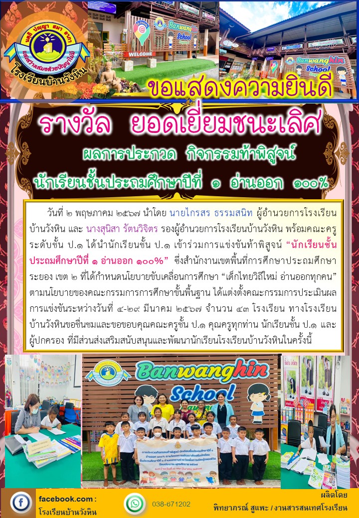 | วันที่ 2 พฤษภาคม 2567 นำโดย นายไกรสร ธรรมสนิท ผู้อำนวยการโรงเรียน บ้านวังหิน และ นางสุนิสา รัตนวิจิตร รองผู้อำนวยการโรงเรียนบ้านวังหิน พร้อมคณะครูระดับชั้น ป.1 ได้นำนักเรียนชั้น ป.1 เข้าร่วมการแข่งขันท้าพิสูจน์ “นักเรียนชั้นประถมศึกษาปีที่ 1 อ่านออก 100%” ซึ่งสำนักงานเขตพื้นที่การศึกษาประถมศึกษาระยอง เขต 2 ที่ได้กำหนดนโยบายขับเคลื่อนการศึกษา “เด็กไทยวิถีใหม่ อ่านออกทุกคน” ตามนโยบายของคณะกรรมการการศึกษาขั้นพื้นฐาน ได้แต่งตั้งคณะกรรมการประเมินผลการแข่งขันระหว่างวันที่ 4-29 มีนาคม 2567 จำนวน 43 โรงเรียน ทางโรงเรียนบ้านวังหินขอชื่นชมและขอขอบคุณคณะครูชั้น ป.1 คุณครูทุกท่าน นักเรียนชั้น ป.1 และผู้ปกครอง ที่มีส่วนส่งเสริมสนับสนุนและพัฒนานักเรียนโรงเรียนบ้านวังหินในครั้งนี้ |