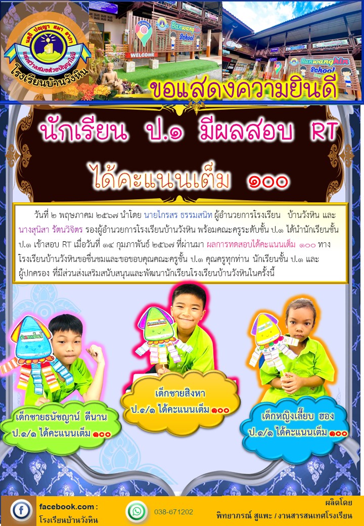 | วันที่ 2 พฤษภาคม 2567 นำโดย นายไกรสร ธรรมสนิท ผู้อำนวยการโรงเรียน บ้านวังหิน และ นางสุนิสา รัตนวิจิตร รองผู้อำนวยการโรงเรียนบ้านวังหิน พร้อมคณะครูระดับชั้น ป.๑ ได้นำนักเรียนชั้น ป.1 เข้าสอบ RT เมื่อวันที่ 14 กุมภาพันธ์ 2567 ที่ผ่านมา ผลการทดสอบได้คะแนนเต็ม 100 ทางโรงเรียนบ้านวังหินขอชื่นชมและขอขอบคุณคณะครูชั้น ป.1 คุณครูทุกท่าน นักเรียนชั้น ป.1 และผู้ปกครอง ที่มีส่วนส่งเสริมสนับสนุนและพัฒนานักเรียนโรงเรียนบ้านวังหินในครั้งนี้ |