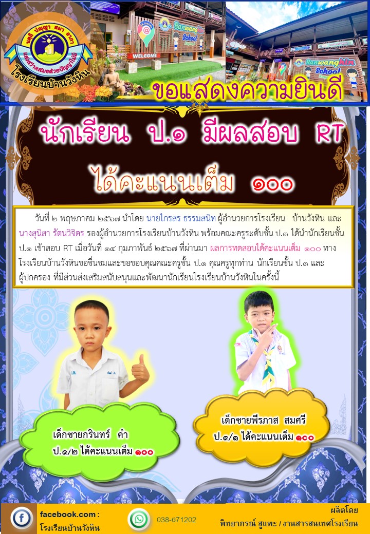 | วันที่ 2 พฤษภาคม 2567 นำโดย นายไกรสร ธรรมสนิท ผู้อำนวยการโรงเรียน บ้านวังหิน และ นางสุนิสา รัตนวิจิตร รองผู้อำนวยการโรงเรียนบ้านวังหิน พร้อมคณะครูระดับชั้น ป.๑ ได้นำนักเรียนชั้น ป.1 เข้าสอบ RT เมื่อวันที่ 14 กุมภาพันธ์ 2567 ที่ผ่านมา ผลการทดสอบได้คะแนนเต็ม 100 ทางโรงเรียนบ้านวังหินขอชื่นชมและขอขอบคุณคณะครูชั้น ป.1 คุณครูทุกท่าน นักเรียนชั้น ป.1 และผู้ปกครอง ที่มีส่วนส่งเสริมสนับสนุนและพัฒนานักเรียนโรงเรียนบ้านวังหินในครั้งนี้ |