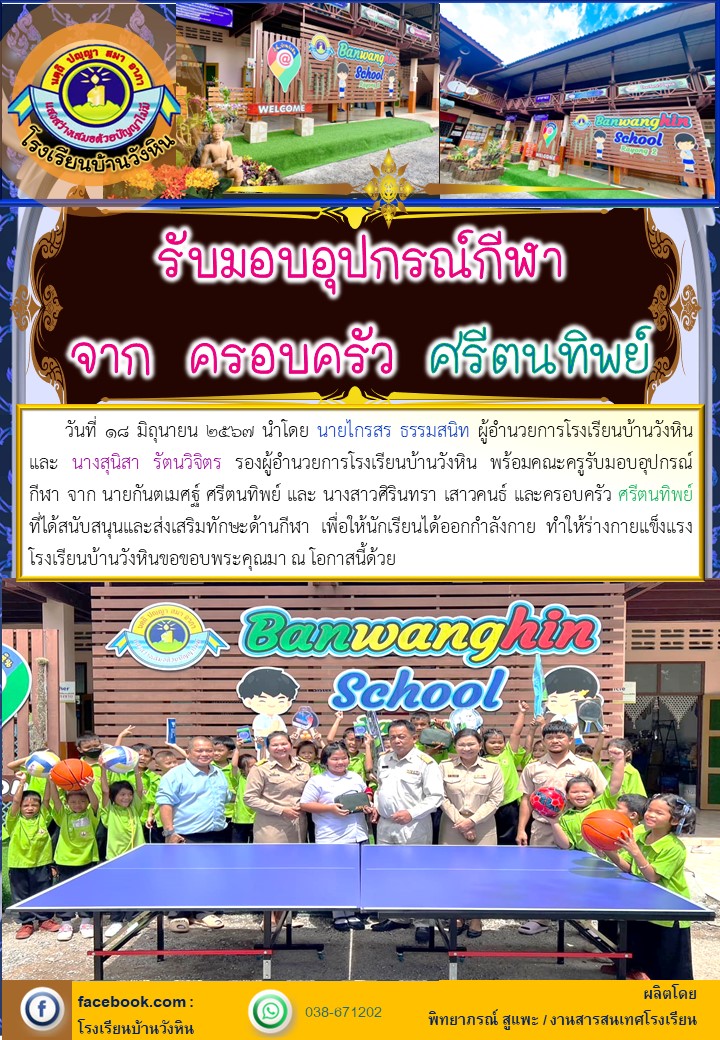 วันที่ 18 มิถุนายน 2567 นำโดย นายไกรสร ธรรมสนิท ผู้อำนวยการโรงเรียนบ้านวังหิน และ นางสุนิสา รัตนวิจิตร รองผู้อำนวยการโรงเรียนบ้านวังหิน พร้อมคณะครูรับมอบอุปกรณ์กีฬา จาก นายกันตเมศฐ์ ศรีตนทิพย์ และ นางสาวศิรินทรา เสาวคนธ์ และครอบครัว ศรีตนทิพย์ ที่ได้สนับสนุนและส่งเสริมทักษะด้านกีฬา เพื่อให้นักเรียนได้ออกกำลังกาย ทำให้ร่างกายแข็งแรง โรงเรียนบ้านวังหินขอขอบพระคุณมา ณ โอกาสนี้ด้วย