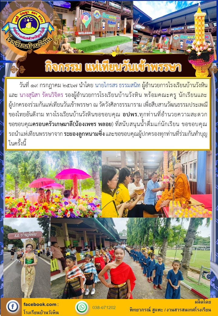 | วันที่ 19 กรกฎาคม 2567 นำโดย นายไกรสร ธรรมสนิท ผู้อำนวยการโรงเรียนบ้านวังหิน และ นางสุนิสา รัตนวิจิตร รองผู้อำนวยการโรงเรียนบ้านวังหิน พร้อมคณะครู นักเรียนและผู้ปกครองร่วมกันแห่เทียนวันเข้าพรรษา ณ วัดวังศิลาธรรมาราม เพื่อสืบสานวัฒนธรรมประเพณีของไทยอันดีงาม ทางโรงเรียนบ้านวังหินขอขอบคุณ อปพร.ทุกท่านที่อำนวยความสะดวก ขอขอบคุณครอบครัวเกษมาลี(น้องเพชร พลอย) ที่สนับสนุนน้ำดื่มแก่นักเรียน ขอขอบคุณ รถนำแห่เทียนพรรษาจาก ระยองลูกหนามซิ่ง และขอขอบคุณผู้ปกครองทุกท่านที่ร่วมกันทำบุญ ในครั้งนี้ |