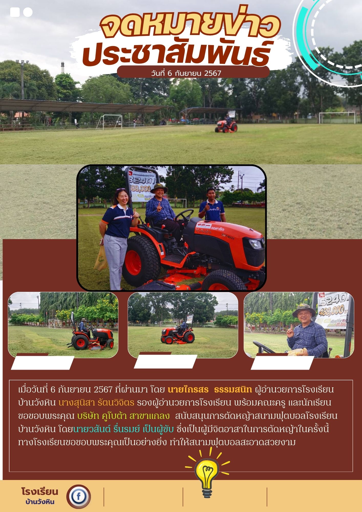 เมื่อวันที่ 6 กันยายน 2567 ที่ผ่านมา โดย นายไกรสร ธรรมสนิท ผู้อำนวยการโรงเรียนบ้านวังหิน นางสุนิสา รัตนวิจิตร รองผู้อำนวยการโรงเรียน พร้อมคณะครู และนักเรียน ขอขอบพระคุณ บริษัท คูโบต้า สาขาแกลง สนับสนุนการตัดหญ้าสนามฟุตบอลโรงเรียนบ้านวังหิน โดยนายวสันต์ รื่นรมย์ เป็นผู้ขับ ซึ่งเป็นผู้มีจิตอาสาในการตัดหญ้าในครั้งนี้ ทางโรงเรียนขอขอบพระคุณเป็นอย่างยิ่ง ทำให้สนามฟุตบอลสะอาดสวยงาม