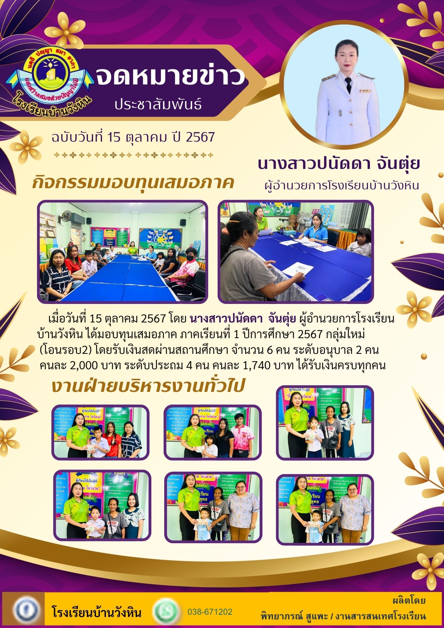 เมื่อวันที่ 15 ตุลาคม 2567 โดย นางสาวปนัดดา จันตุ่ย ผู้อำนวยการโรงเรียนบ้านวังหิน ได้มอบทุนเสมอภาค ภาคเรียนที่ 1 ปีการศึกษา 2567 กลุ่มใหม่(โอนรอบ2) โดยรับเงินสดผ่านสถานศึกษา จำนวน 6 คน ระดับอนุบาล 2 คนคนละ 2,000 บาท ระดับประถม 4 คน คนละ 1,740 บาท ได้รับเงินครบทุกคน