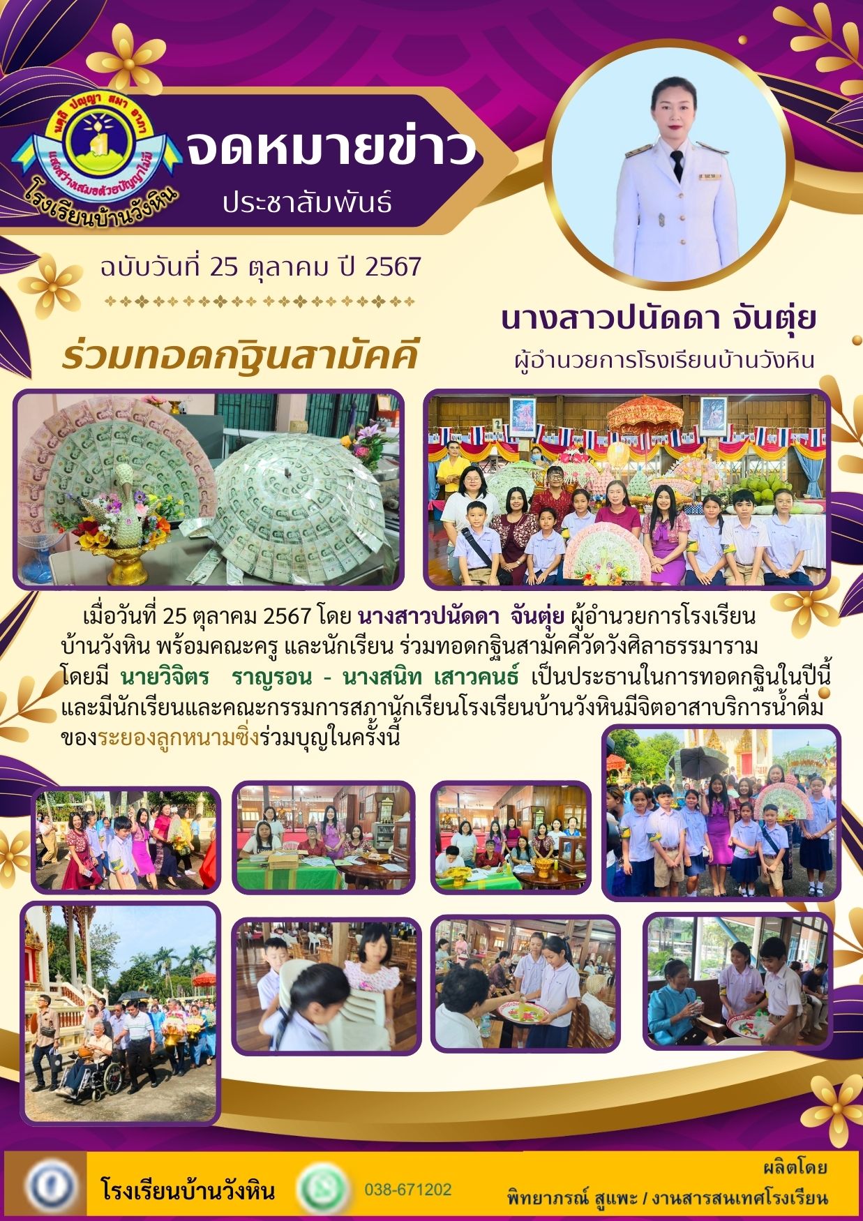 เมื่อวันที่ 25 ตุลาคม 2567 โดย นางสาวปนัดดา จันตุ่ย ผู้อำนวยการโรงเรียนบ้านวังหิน พร้อมคณะครู และนักเรียน ร่วมทอดกฐินสามัคคีวัดวังศิลาธรรมารามโดยมี นายวิจิตร ราญรอน - นางสนิท เสาวคนธ์ เป็นประธานในการทอดกฐินในปีนี้ และมีนักเรียนและคณะกรรมการสภานักเรียนโรงเรียนบ้านวังหินมีจิตอาสาบริการน้ำดื่มของระยองลูกหนามซิ่งร่วมบุญในครั้งนี้