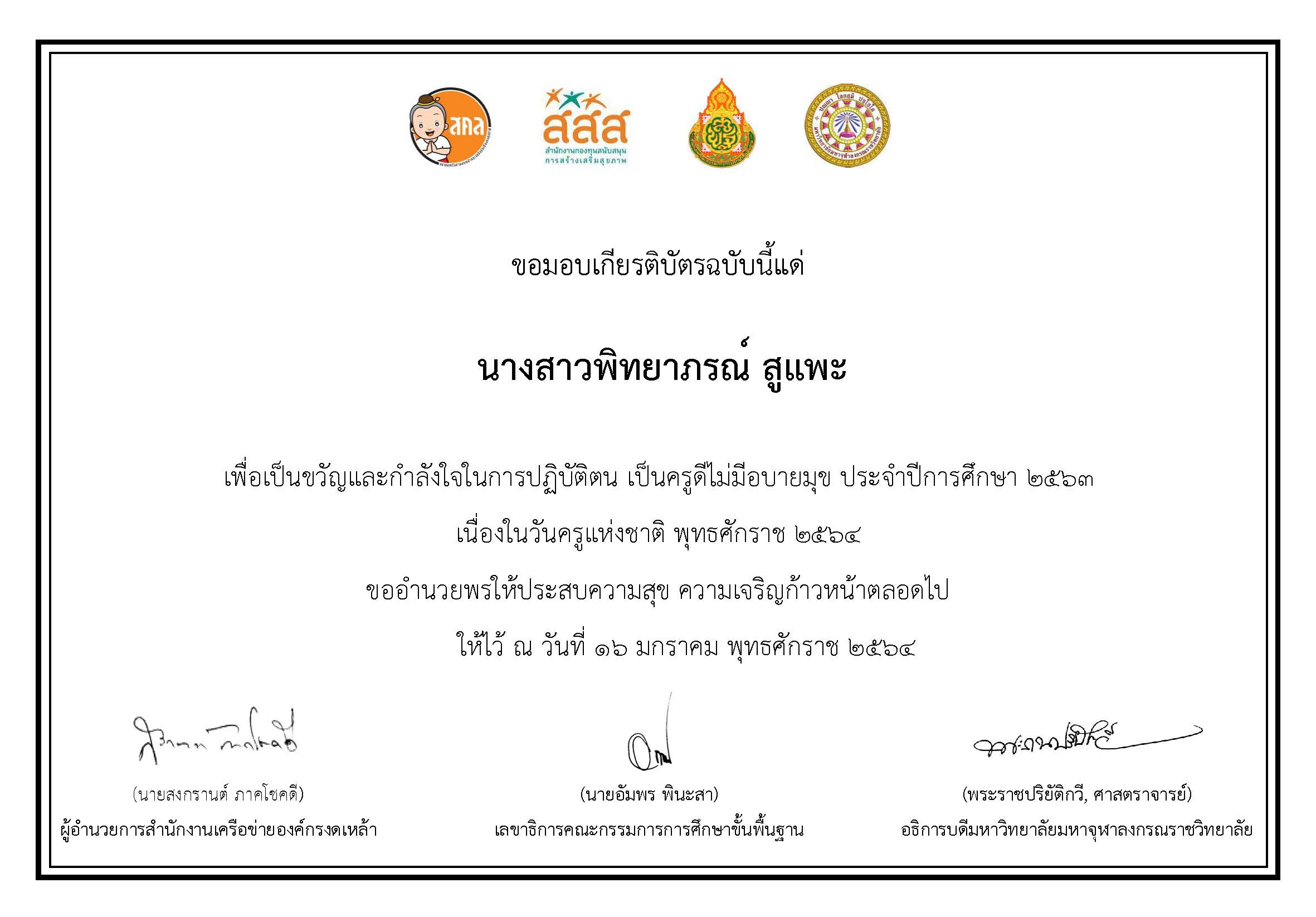 ชื่อผลงาน : รางวัลครูดีไม่มีอบายมุข 2564